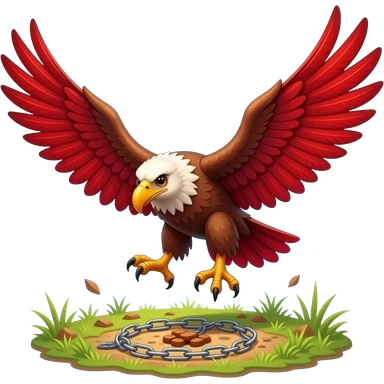 Sampati, the giant vulture prince with red wings, watchful eyes from the sky, clearing traps below, fierce expression, sunny sky background, card game style. emoji