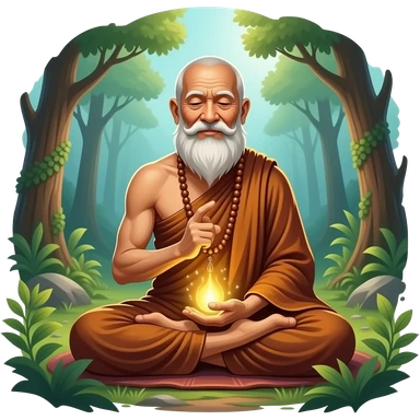 Hermit in traditional Thai pose of ascetics (Lersi Dat Ton), old wise man with beard, meditating with glowing energy, holding a rosary, mystical forest background, ancient Thai style. emoji