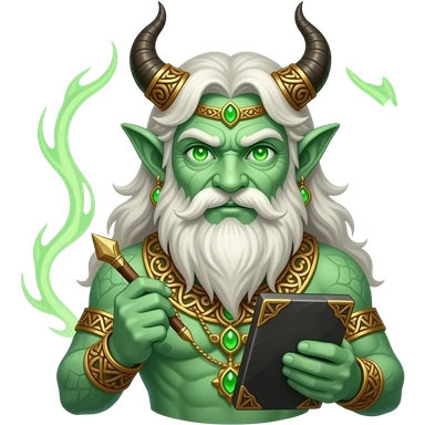 Phiphek, the seer demon with light green skin, glowing eyes of prophecy, holding an ancient slate and stylus, wise expression, intricate ornaments, mystical energy surrounding. emoji