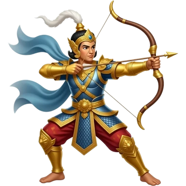 Phra Lak, the younger brother of Rama with golden skin, holding a divine bow, dynamic movement with wind trails, royal guard armor, swap ability concept, blurred motion background. emoji
