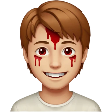 парень с русыми волосами средней длины; белая кожа; белые глаза; открытая улыбка, где на зубах кровь; emoji