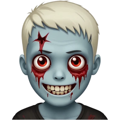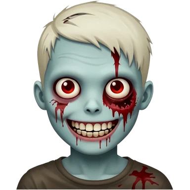 zombie boy with emo short hair, white skin, and white eyes; an open smile, and bloodied teeth; emoji