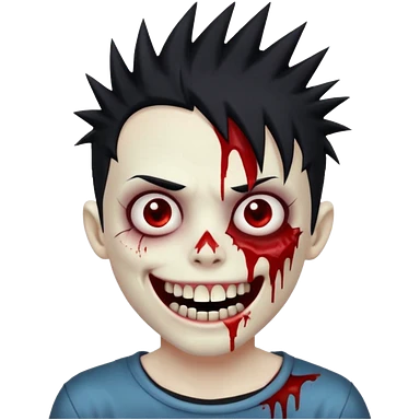 zombie boy with emo spiky hair, white skin, and white eyes; an open smile, and bloodied teeth; emoji