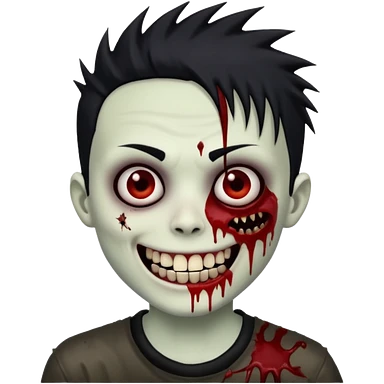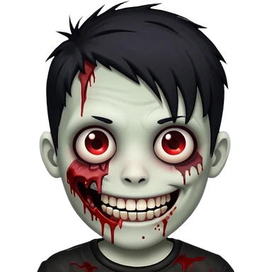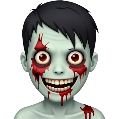 zombie boy with emo hair, white skin, and white eyes; an open smile, and bloodied teeth; emoji