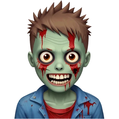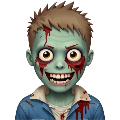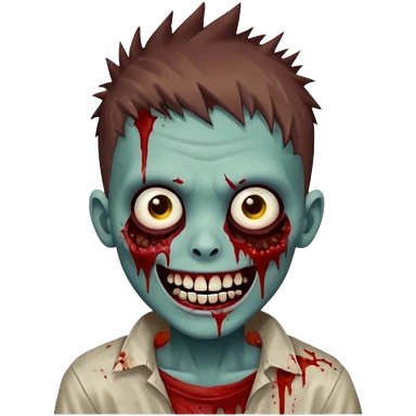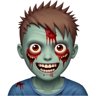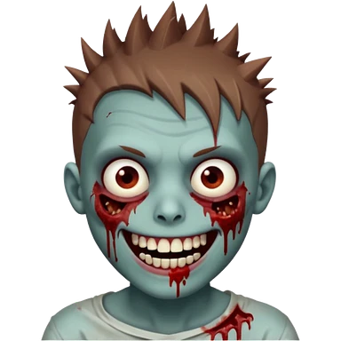 zombie boy with brown short spiky hair, white skin, and white eyes; an open smile, and bloodied teeth; emoji