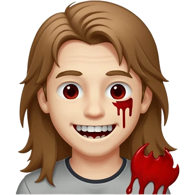 парень с русыми длинными волосами; бледная сероватая кожа; белые глаза; открытая улыбка, где на зубах кровь; emoji