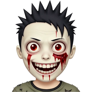 zombie boy withemo spiky hair, white skin, and white eyes; an open smile, and bloodied teeth; emoji