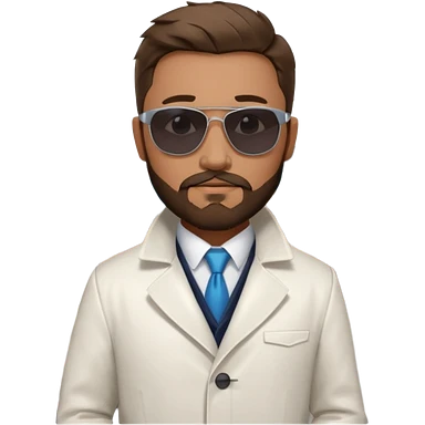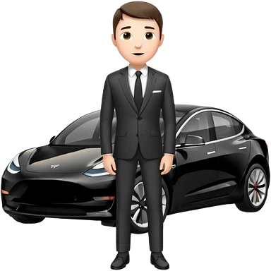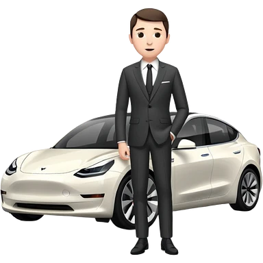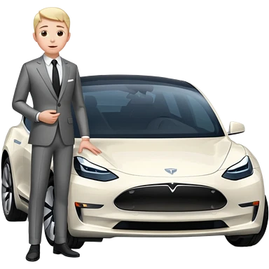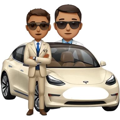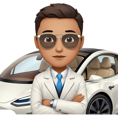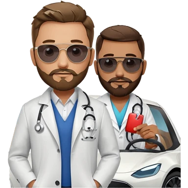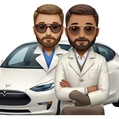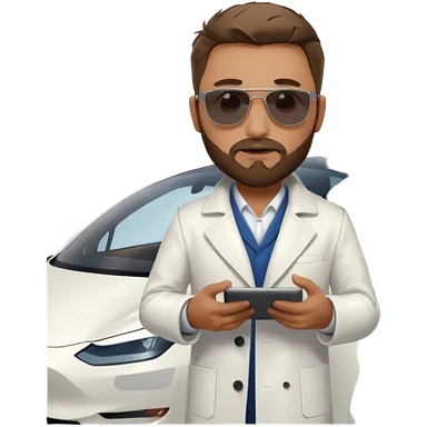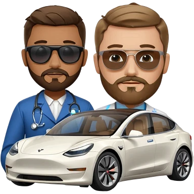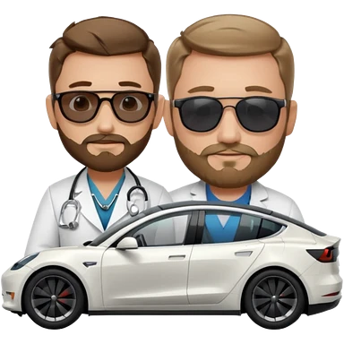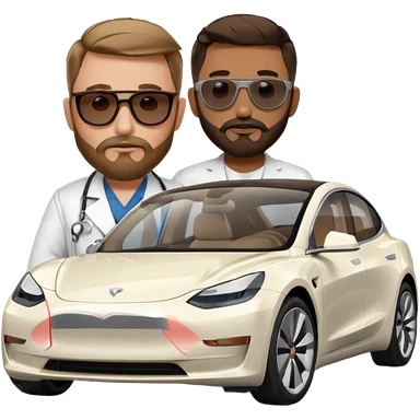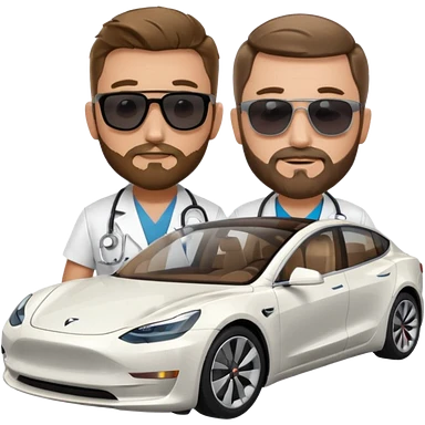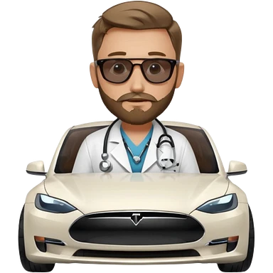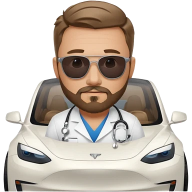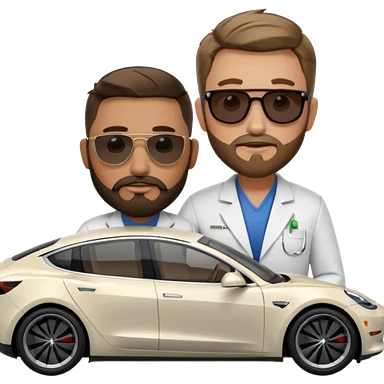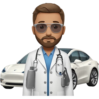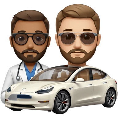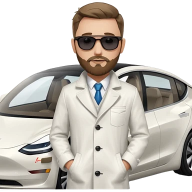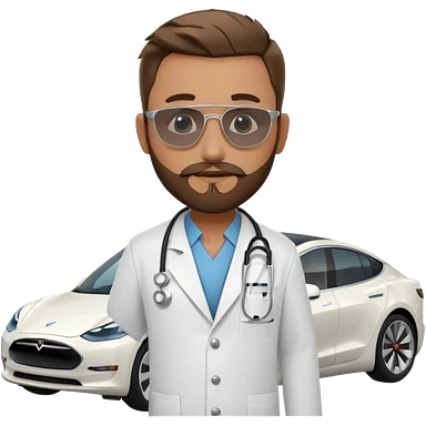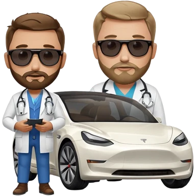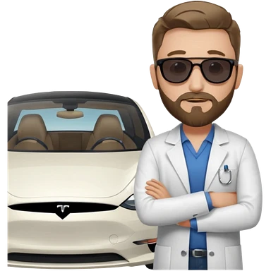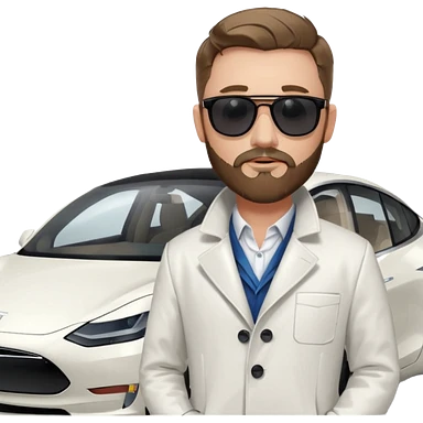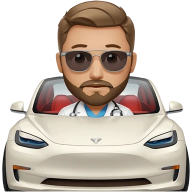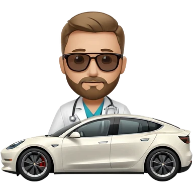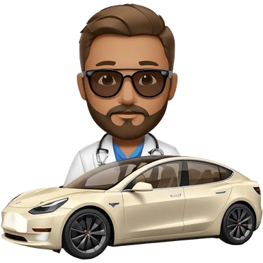 White tesla model 3 with a cool physician with dark blond hair, beard and dark sunglasses next to it emoji