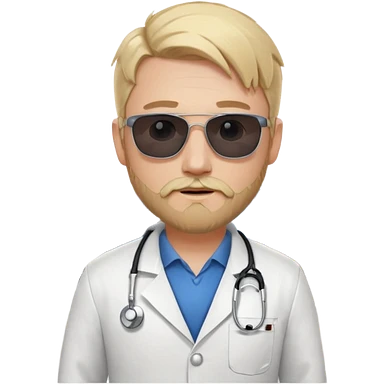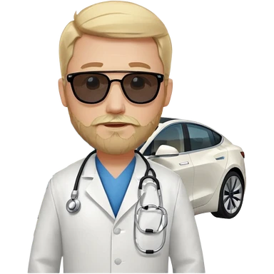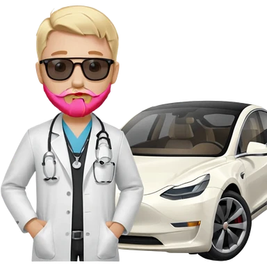 White tesla model 3 and one cool physician with blond hair, beard, stetoscope and dark sunglasses next to it emoji