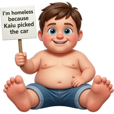 make a ugly megamind brown haired kid with a sign that says im homeless because kaiu picked the car and make him have big massive feet and no shirt and make sure hes fat make him have chubby face cheeks and make him smirking and make him realistic emoji