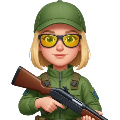 Green hunting woman with glasses and long blonde curly hair carrying a rifle emoji