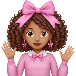 brown girl with long brown curly hair and bows in her hair waving wearing pink emoji