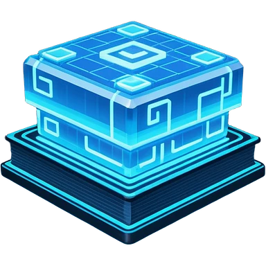 Futuristic holographic data book icon, dark sci-fi interface style, crystal neon blue light, sharp geometry, high tech game UI icon, minimalistic, cyber space theme, volumetric glow, centered, transparent background, no cartoon, no cute, no emoji face, 100x100 px emoji
