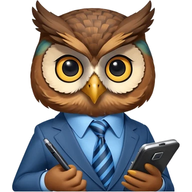 Сова в галстуке держит телефон крылом, внимательно слушает, блокнот под лапой emoji
