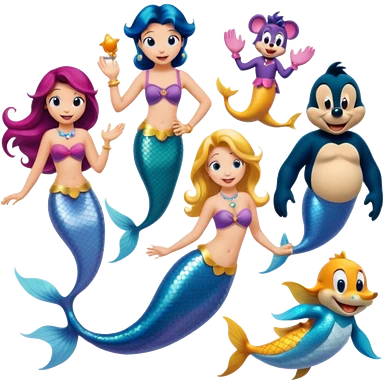 Colorful icon for Animated Movies: mermaid costume and could A vibrant collage featuring iconic characters like Goofy, Mickey Mouse, Franco, Masha and the Bear and Luntik. Each character should be large and bright, set against a cheerful and playful background of Disneyland. Transparent background. emoji