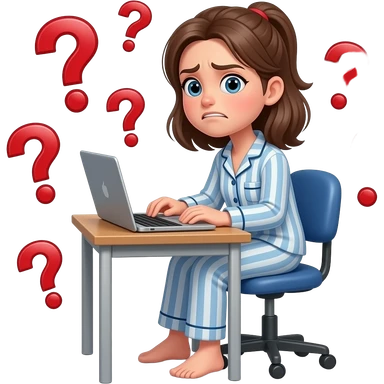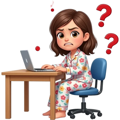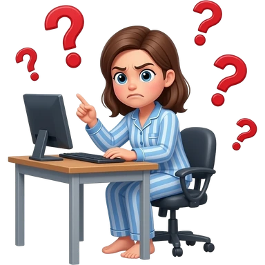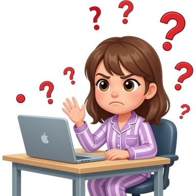 a girl in her pajama sitting at the desk turning around to us with disgusted expression and raised eyebrows - around her there are red question marks in the air emoji