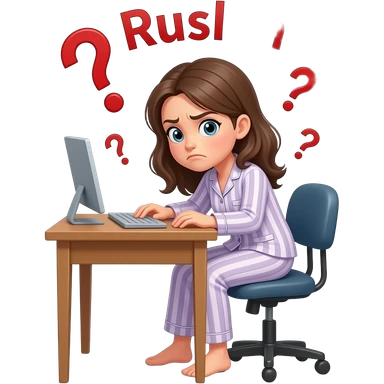 a girl in her pajama sitting at the desk turning around to us with disgusted expression and raised eyebrows - around her there are red question marks in the air and the red phrase also in the air: Ruslan emoji