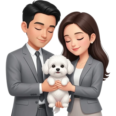 An emoji depicting a stylish Asian couple with faint smiles, peacefully closing their eyes while cradling a small white Maltese with both arms; both individuals and the puppy have their eyes shut, with their heads slightly tilted toward the center in a serene embrace. emoji