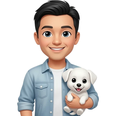 An emoji of a smiling Asian man with black hair holding a white puppy. emoji