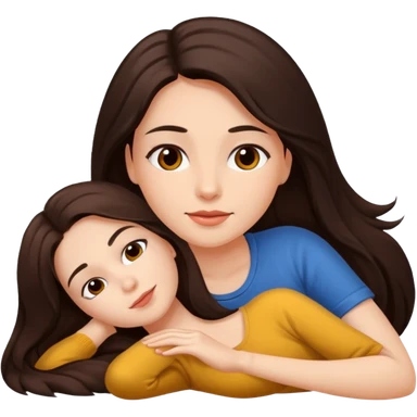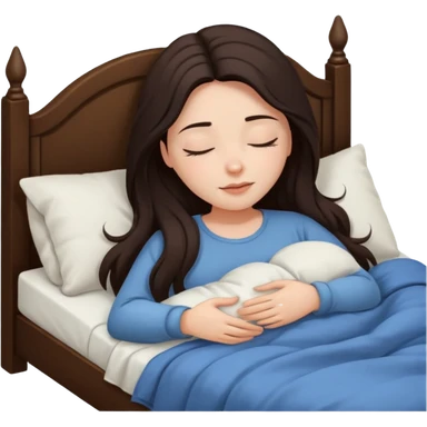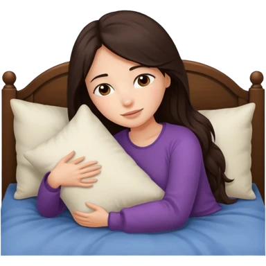 Mujer de pelo cafe oscuro y largo, y tez blanca. Ella esta en su cama abrazando su almohada porque ya se va a dormir emoji