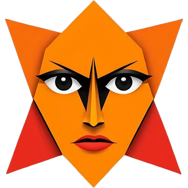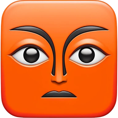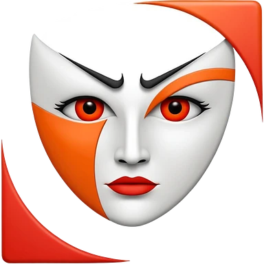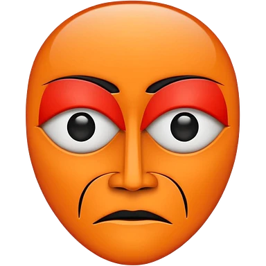 Flat vector logo icon, abstract evil face symbol. Geometric and minimal design. Face split vertically by a thin straight black line. Left side solid red, right side solid orange. Only eyes and mouth visible. No nose, no facial lines, no cheeks, no anatomy. emoji