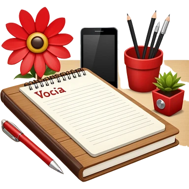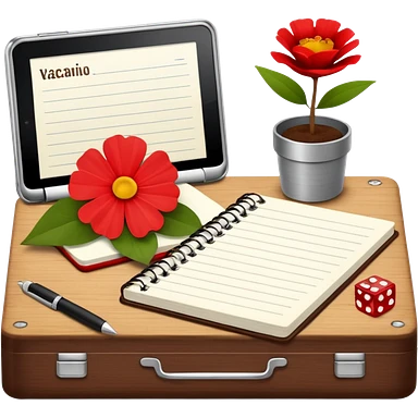 un letrero que diga VACACIONES y detrás un escritorio moderno, con una notebook, una agenda y una planta con una flor emoji