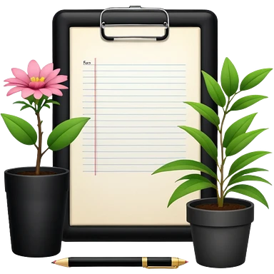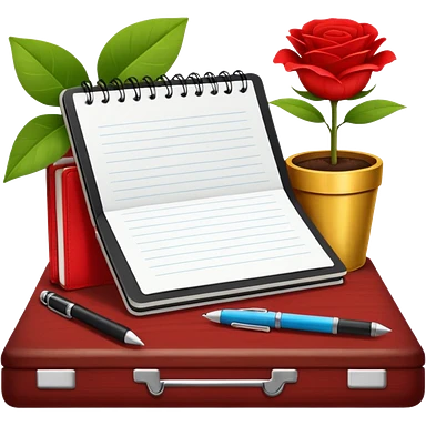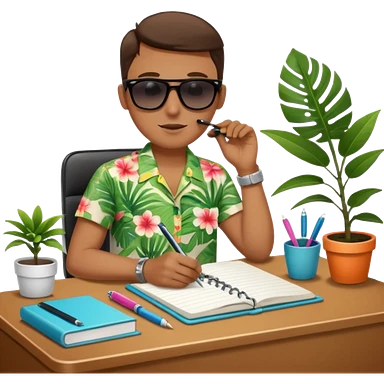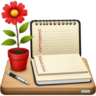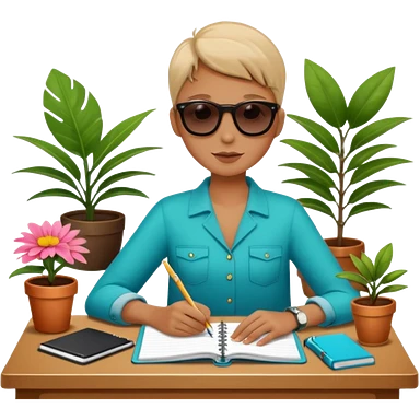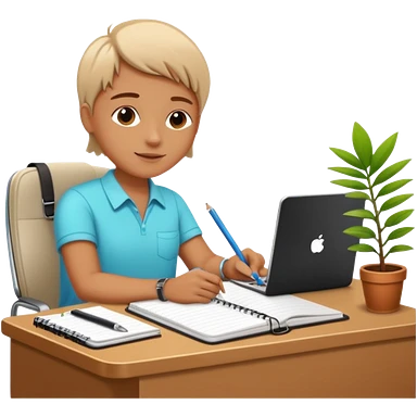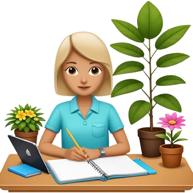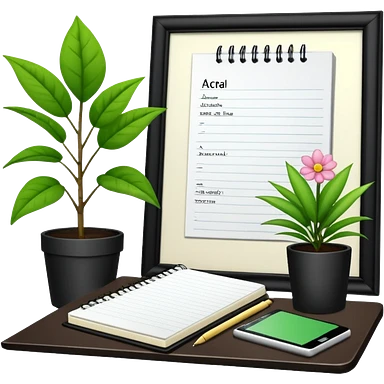 F U E R A DE O F I C I N A y detrás un escritorio moderno, con una notebook, una agenda y una planta con una flor emoji