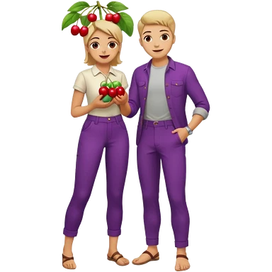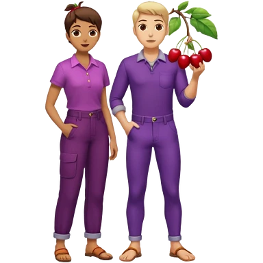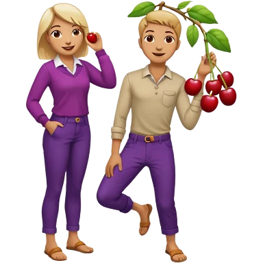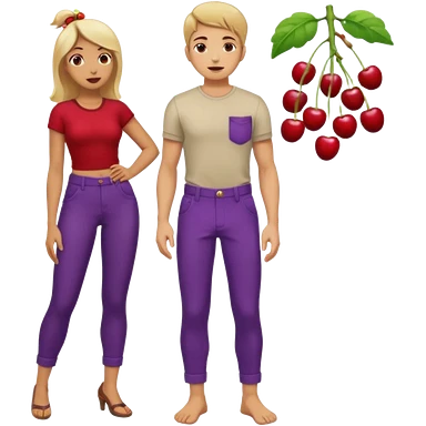 Can you merge the cherries π with π together they should hang on the body at the pocket part π§πΌ. Together I also want to have this emoji π§π»ββοΈββ‘οΈin front of me where she is looking at the cobbled together ππ hanging on my pants emoji