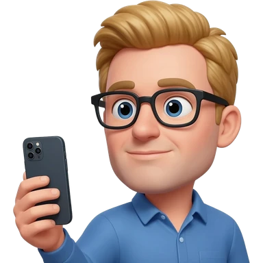 man with dirty blonde hair and black rectangle glasses - blue shirt, facetiming and the camera is low so he has a double chin. emoji
