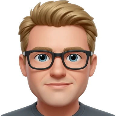man with dirty blonde hair and black rectangle glasses - the angle of the emoji is like i would be looking at him on facetime and the camera is low so he has a double chin. emoji