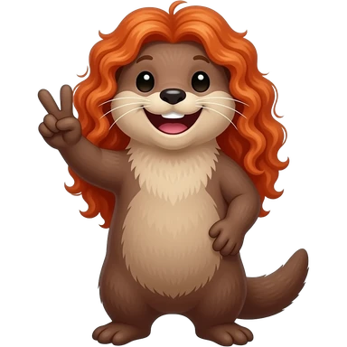 River otter with long curly red hair smiling wide holding up peace sign emoji