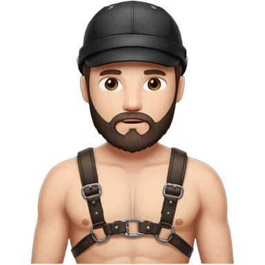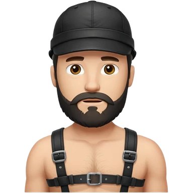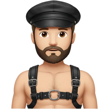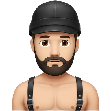 a bearded, leather Dom with a black leather cap and black chest harness over a naked chest emoji