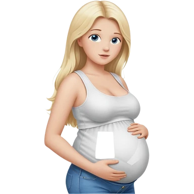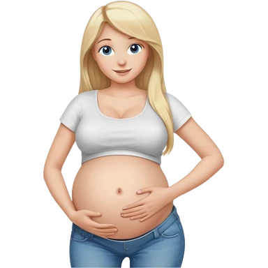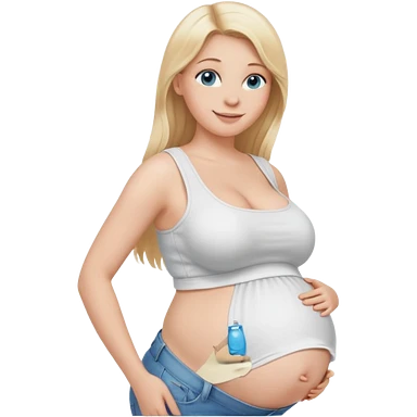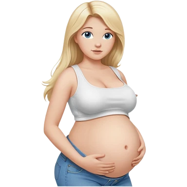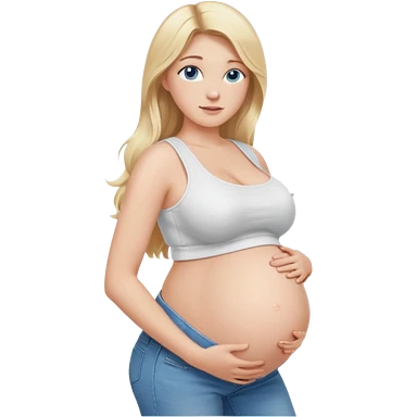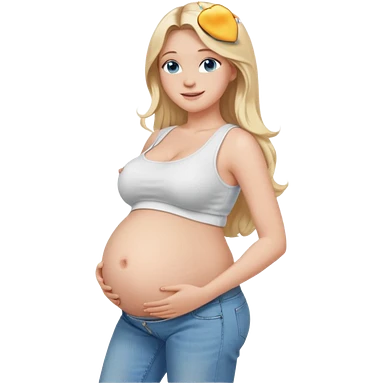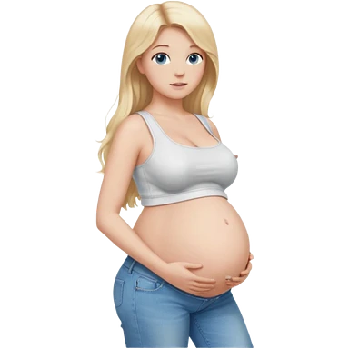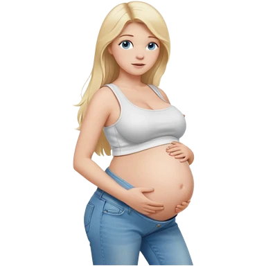 White girl, long blonde hair, white tank crop top, smiling, bare midriff, blue eyes, huge round pregnant belly, jeans. emoji