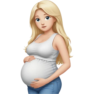 White girl, long blonde hair, white tank crop top, smiling, bare midriff, blue eyes, huge round pregnant belly, jeans, side view emoji