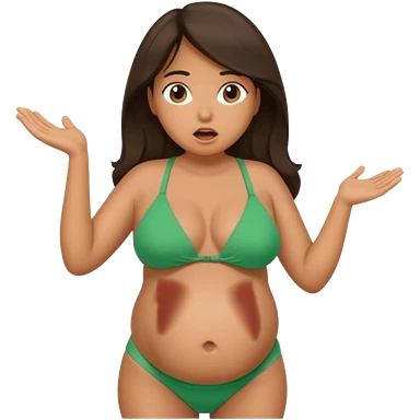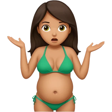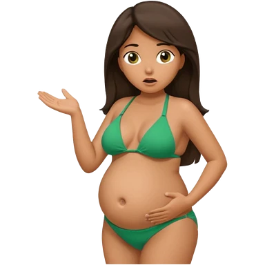 Latina girl, tan skin, pregnant, green bikini, shocked face, shrugging shoulders, huge belly, side view emoji