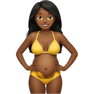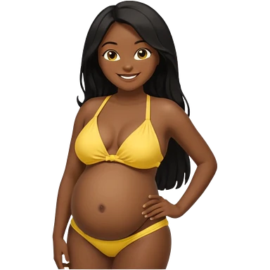 Dark skin african black girl long black hair, yellow bikini top, smiling, bare midriff, brown eyes, huge round pregnant belly, yellow bikini bottoms, side view emoji