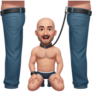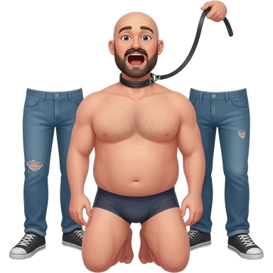 2 tall men in jeans with only legs visible control a shorter bald stocky 35 year old man on his knees with a collar and leash. He has mouth wide open, mustache and beard, in underwear, slightly hairy chest emoji
