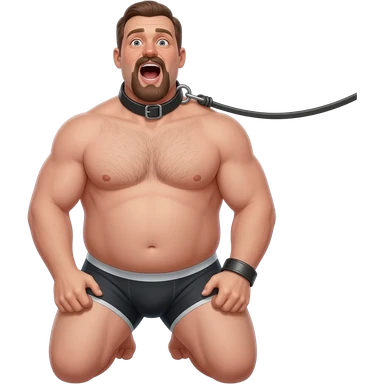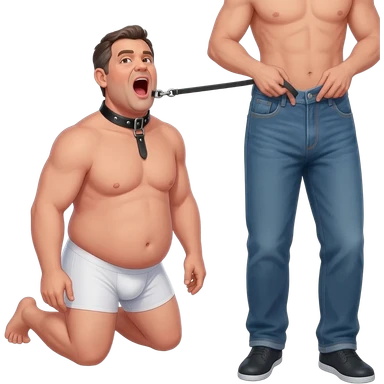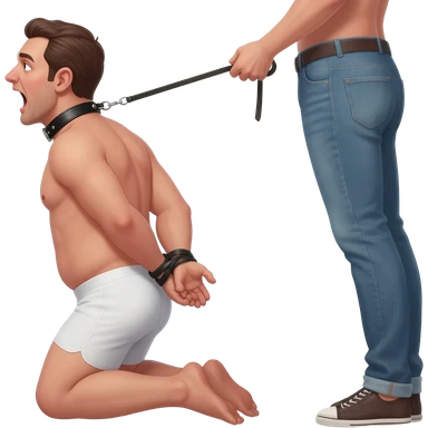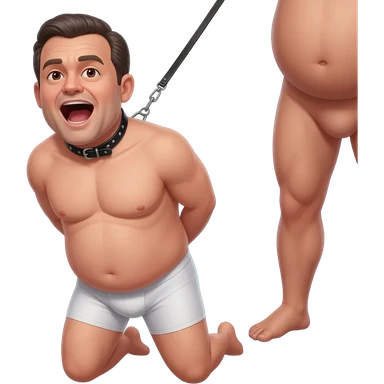Fourty year old chubby guy in white briefs on his knees with mouth wide open and a black leather collar around his neck and hands tied behind his back. a man stands behind him with only his legs visible and pulling on a leash attached to the collar emoji