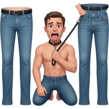 2 big men in jeans with only their legs visible. They surround a smaller nude man on his knees with mouth open sand tongue sticking out wearing a black collar with a leash held by one of the men emoji