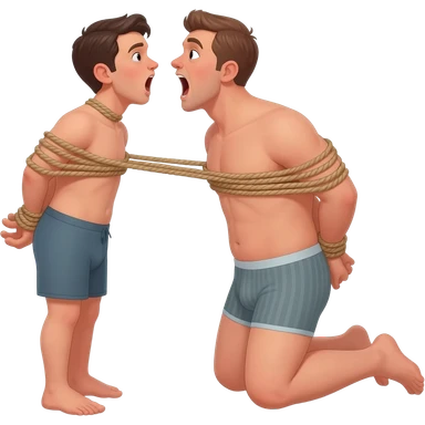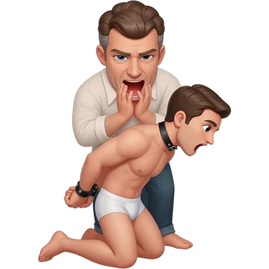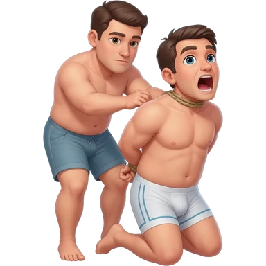 thirty year old guy wearing boxershorts standing on his knees in front of another man with mouth wide open and hands tied behind his back with ropes emoji