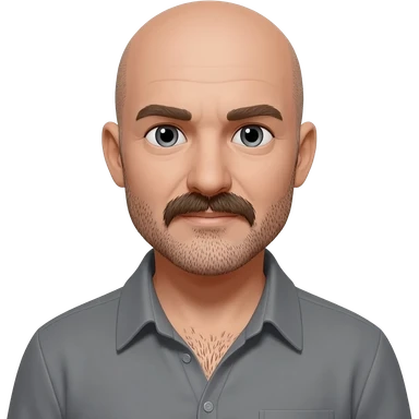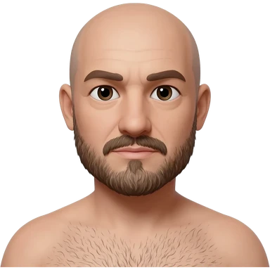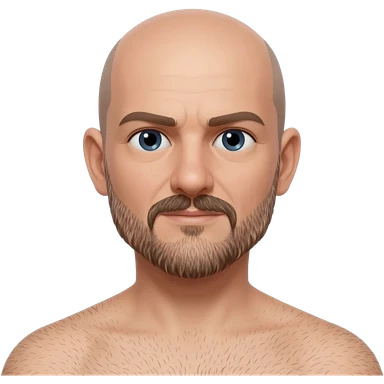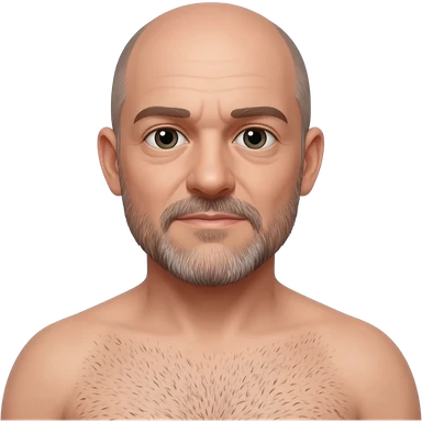 Bald 40 year old man with mustache and beard. Slightly hairy chest emoji