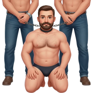 Bald 35 year old man with mustache and beard in underwear and slightly hairy chest put on a leash by 2 men in jeans emoji