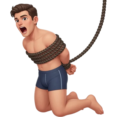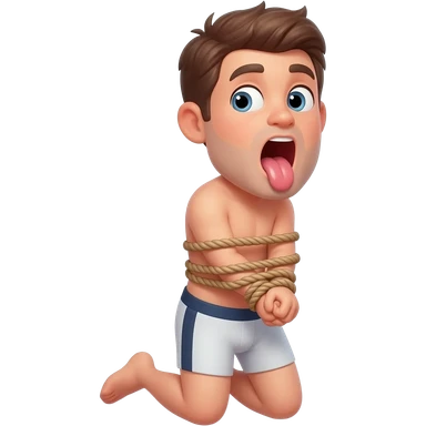 thirty year old guy wearing boxershorts standing on his knees with mouth wide open and hands tied behind his back with ropes emoji