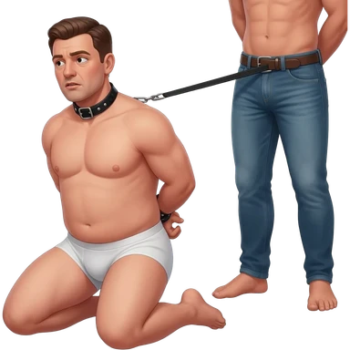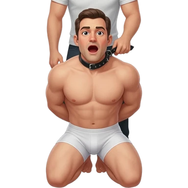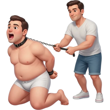 Fourty year old chubby guy in white briefs on his knees with mouth wide open and a black leather collar around his neck and hands tied behind his back. a man stands behind him pulling on a leash attached to the collar emoji
