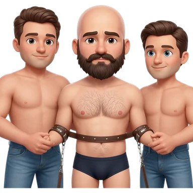 Bald stocky 35 year old man with mustache and beard in underwear and slightly hairy chest on a leash controlled by 2 taller men in jeans emoji