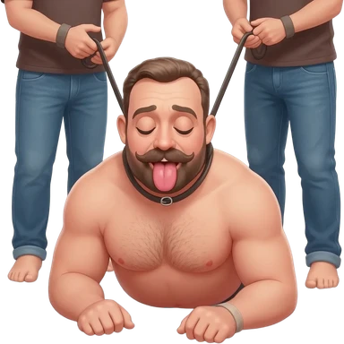 2 men in jeans with only legs visible control a shorter bald stocky 35 year old man on his knees with a collar and leash. He has mouth wide open, mustache and beard, in underwear, slightly hairy chest emoji