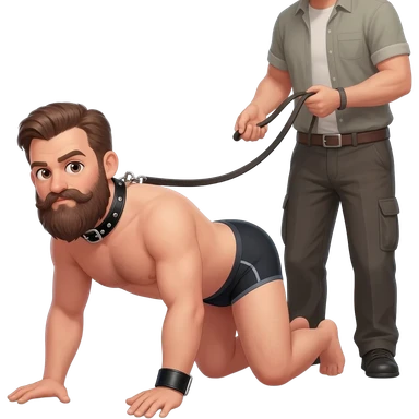 bald bearded man in underwear and a leather collar stands on all fours controlled by a man holding his leash emoji
