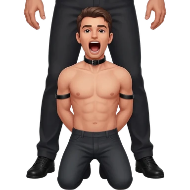 thirty year old nude guy on his knees with mouth wide open and a black leather collar around his neck and hands tied behind his back and a man stands behind him on his feet emoji