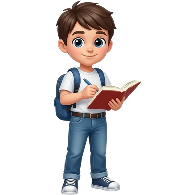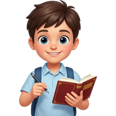 एक किताब का इमोजी बनाओ जो की एक लड़का एक हाथ से तो पड़ी हुई है किताब और दूसरे हाथ से कुछ लिख रहा हो किताब में और लड़का खड़ा होना चाहिए अरे यह बैग हटाओ लड़के का मुंह किताब की तरफ होना चाहिए यह बैग हटाओ और कुछ अच्छे कपड़े पहनो emoji