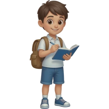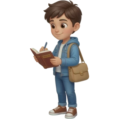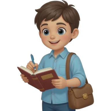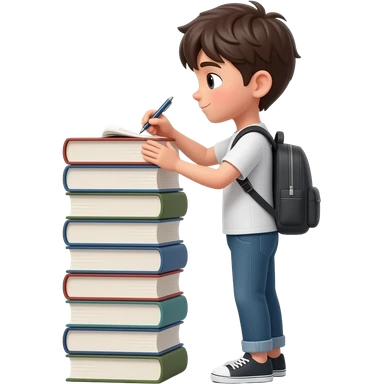 एक किताब का इमोजी बनाओ जो की एक लड़का एक हाथ से तो पड़ी हुई है किताब और दूसरे हाथ से कुछ लिख रहा हो किताब में और लड़का खड़ा होना चाहिए अरे यह बैग हटाओ emoji